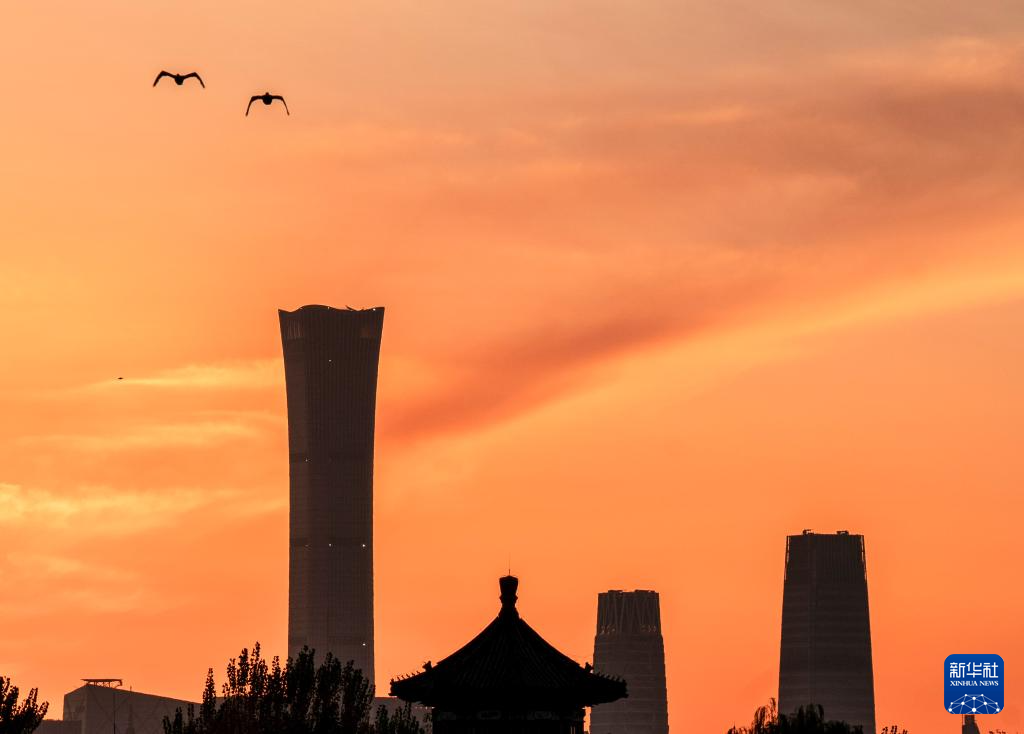 11月10日拍摄的北京日出。11月10日清晨,北京的晨光略显潮湿,天空布满了明亮的灯光。中华尊、凉亭等标志性建筑与晨光中什刹海的光影相交。图片提供:新华社记者张永嘉。
